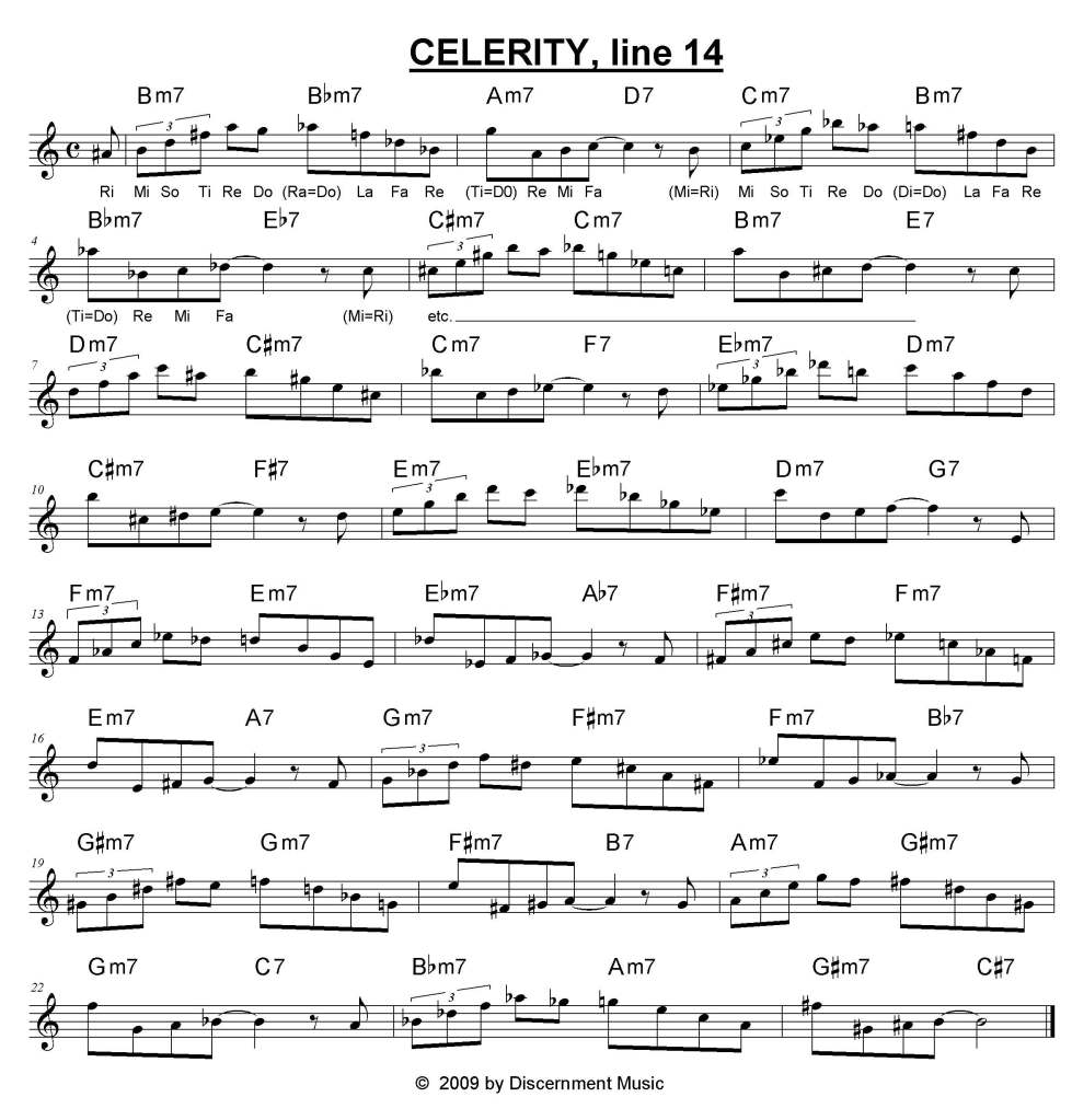 A phrase from the Charlie Parker (Bird) solo on “Celerity” played in all 12 keys without using changing key signatures.