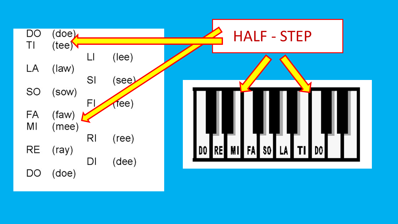From these pictures, you can see that the half-steps occur between MI & FA and between TI & DO. This is the rule, regardless of which key you’re in. There is a whole-step In between the other notes of the scale (DO-RE, RE-MI, FA-SO, SO-LA, & LA-TI). There are 12 major scales, each with a different DO. The form of every major scale is the same.