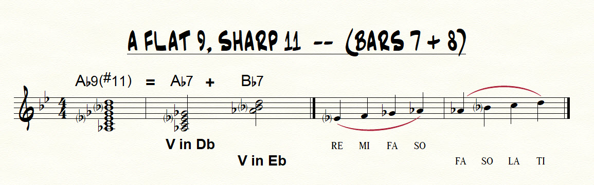 The Ab9(#11) merits some discussion (refer to the illustration below the chart). I hear the Ab9(#11) as a polychord consisting of Ab7 and Bb7. Ab7 is a V chord in Db, while Bb7 is a V chord in Eb. The resulting “poly-scale” (see sketch below), which I use to improvise over this chord, consists of RE MI FA SO in Db and FA SO LA TI in Eb. While rather unorthodox, this picture works for me. If it appeals to you, try experimenting with that method.