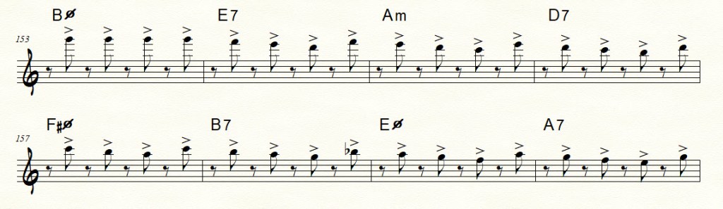 b.) The beginning of chorus 3 shows a series of 5 eighth notes on upbeats, almost like a syncopated stutter. This prepares the way for similar clusters of eighth notes, culminating in the bridge at bar 153 consisting of 32 (!) consecutive eighth notes on upbeats.