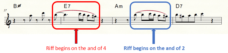 a.) Below is a picture and recording of bars 57-60. They contain a motif which is repeated, but not on the same beat. The first time, the lick starts on the and of beat 4, the second on the and of beat 1. This is called playing “on the other side” (the other side of the beat or bar).