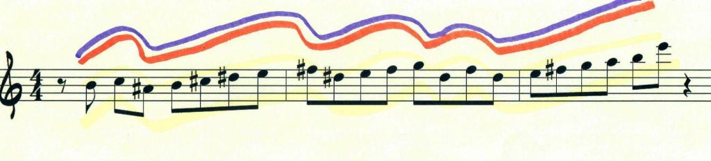 On a clear winter day, looking toward the Olympic Mountain Range, you see its intriguing contours, the heavy snowpack accentuating its unique sawtooth pattern. In the same way, you can shape your melodic phrase so its contour captivates your audience. Below you see bars 149-151, The colored lines emphasize the melodic contour of this phrase.