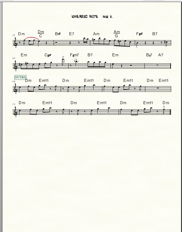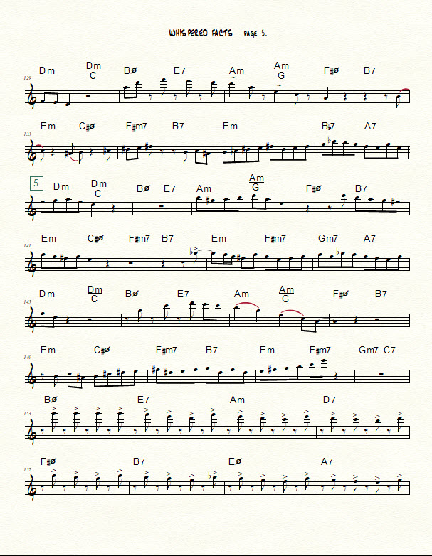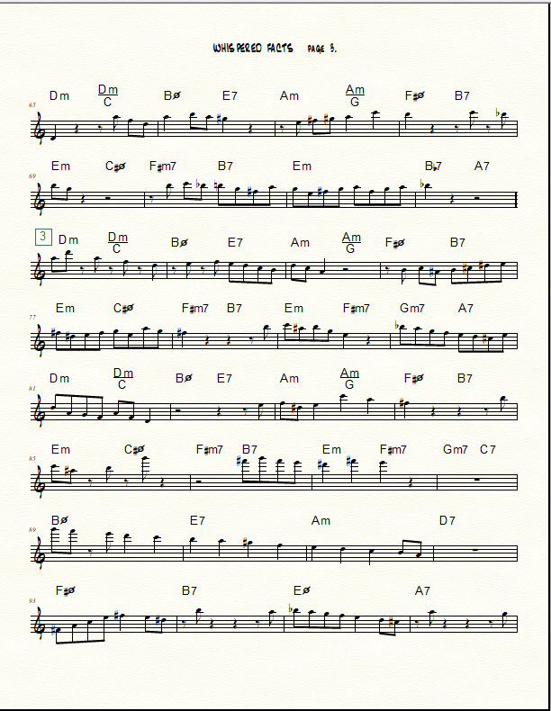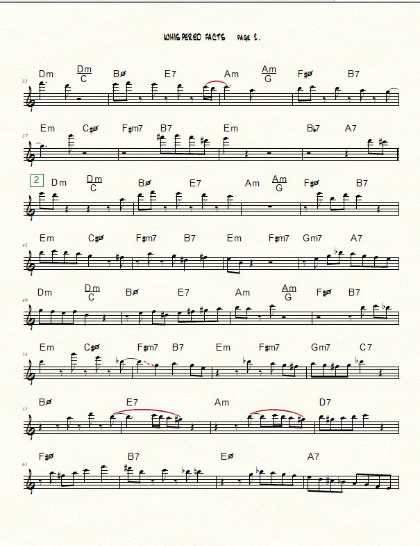 A transcription of my five-chorus improv over the changes to “Whisper Not” for Bb instruments is provided at the bottom of this post. (Contact me using the “contact us” form at the bottom of this post if you need a chart in another key or in bass clef.) The beginning of each chorus is marked with a boxed number. As you peruse the chart, notice the use of diverse rhythmic figures such as those described below.