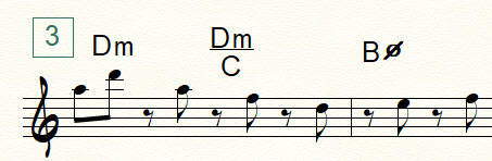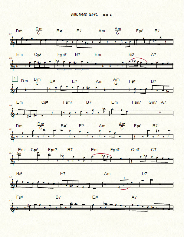 A transcription of my five-chorus improv over the changes to “Whisper Not” for Bb instruments is provided at the bottom of this post. (Contact me using the “contact us” form at the bottom of this post if you need a chart in another key or in bass clef.) The beginning of each chorus is marked with a boxed number. As you peruse the chart, notice the use of diverse rhythmic figures such as those described below.