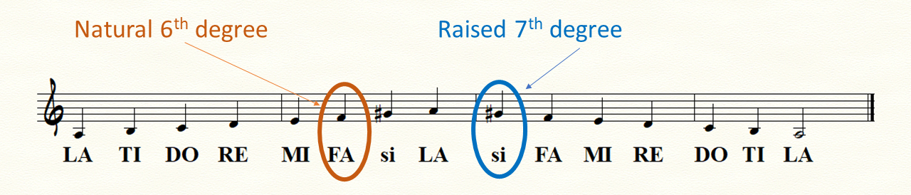 Pianist Dr. J. H. asked for a melodious exercise he could use to explore the harmonic minor scale in all 12 keys. The “harmonic minor scale” features the natural 6th degree FA along with the raised 7th degree. The raised 7th degree in a minor scale is the syllable known as “si” (pronounced “SEE”). It’s also referred to as “#SO” or “#7.” That scale is shown here: